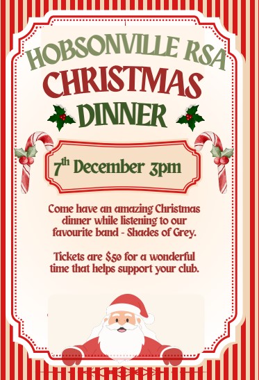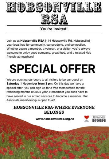 The Hobsonville RSA Women's Section is looking for new members. Every 4th Tuesday of the Month starting at 1pm.